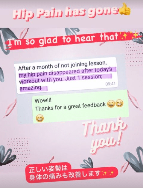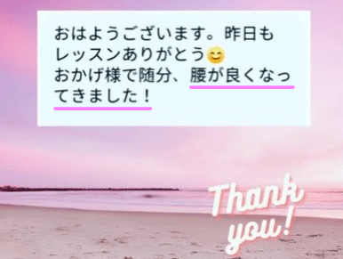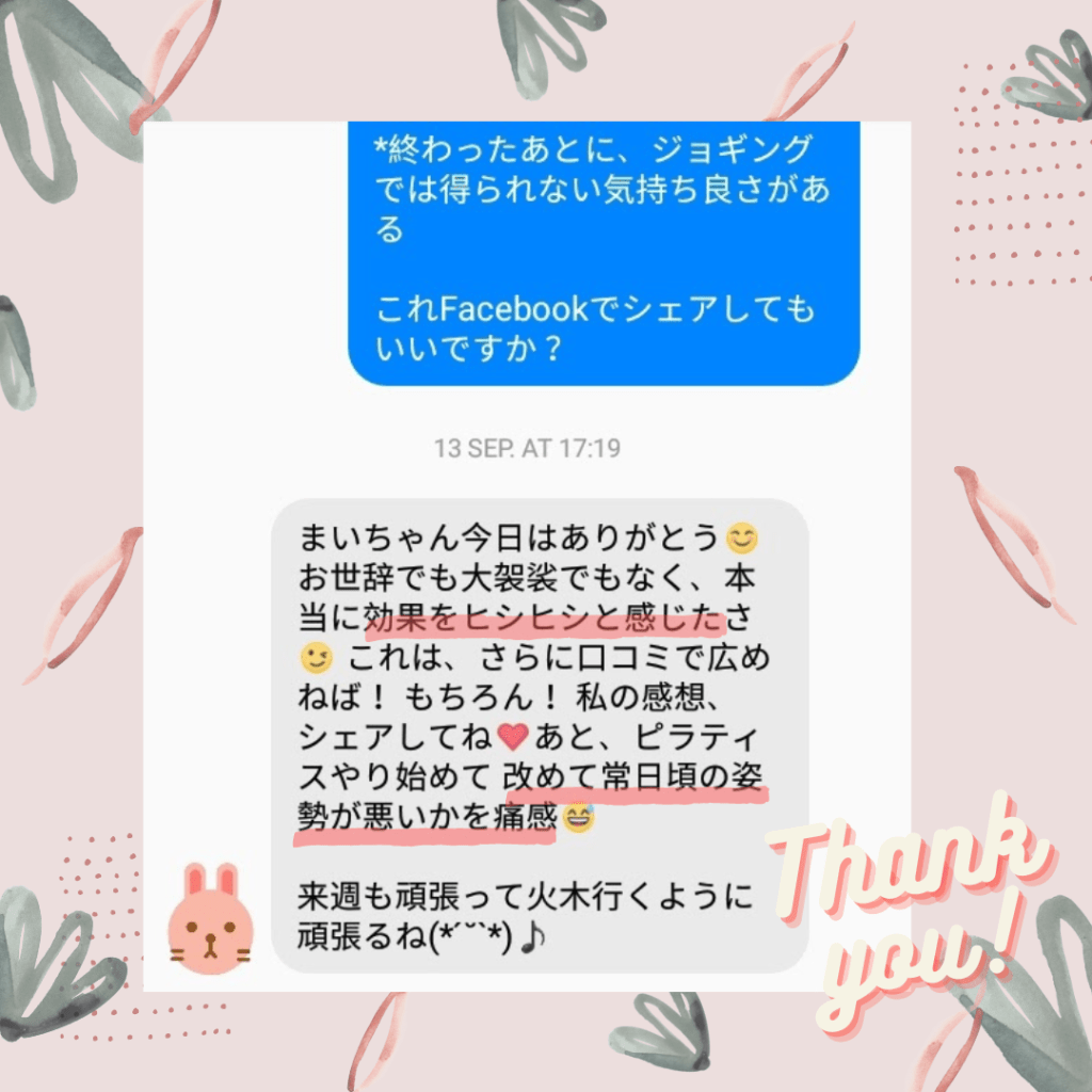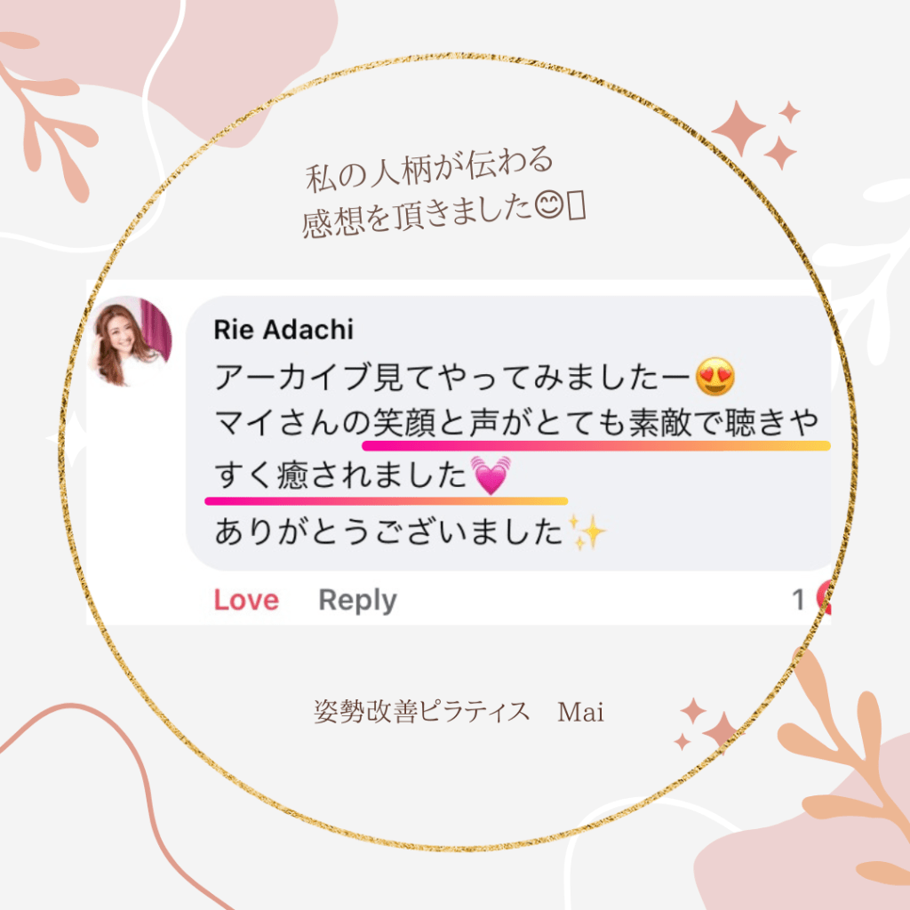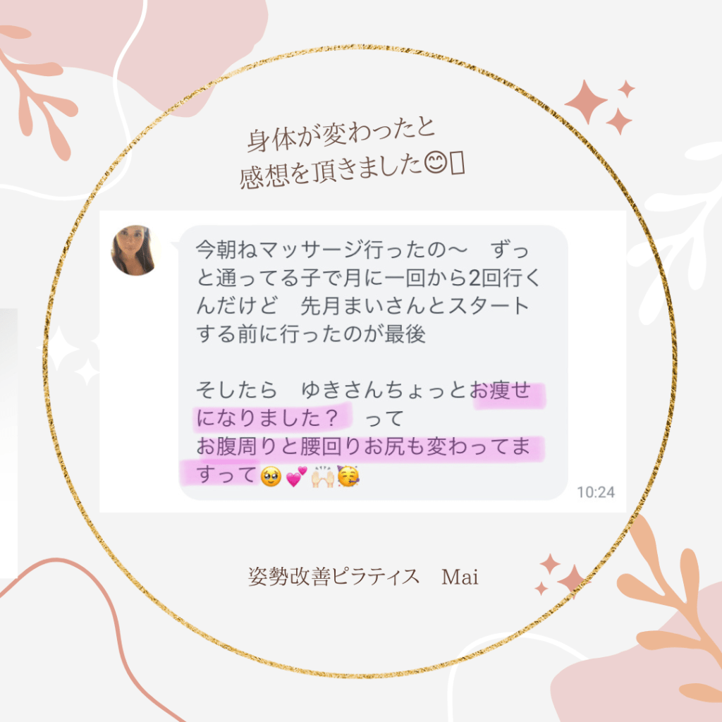 お客様の声 1か月サポートコースのお客さま ↓ 朝のボディチェックが楽しみで早起きに ♪ お腹、肋骨が一回り締まった ♪ 時計のバンドの穴が小さい箇所になった ♪ 回りの方が変化に気付いてくれた♪ 旦那さんにセクシーと褒められた ♪ 姿勢改善ピラティスグループクラスの方 ↓ 日頃の姿勢に気付くことも大切ですね☆ 基本からしっかりやるので初心者でも安心です☆+ たまにはシドニーの雰囲気も伝えていきますよ☆ 痛かった腰も楽になります ♪ 人柄が伝わる感想をいただきました☆ お尻の痛みも消えちゃいます ♪ Share this: Share on X (Opens in new window) X Share on Facebook (Opens in new window) Facebook Like Loading...